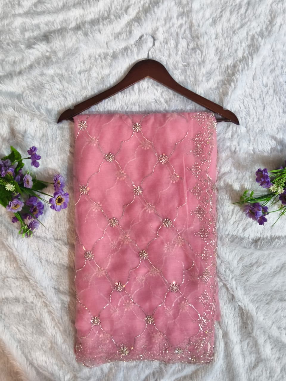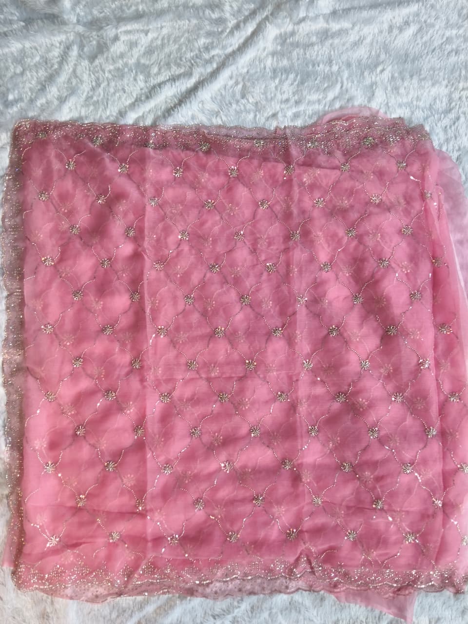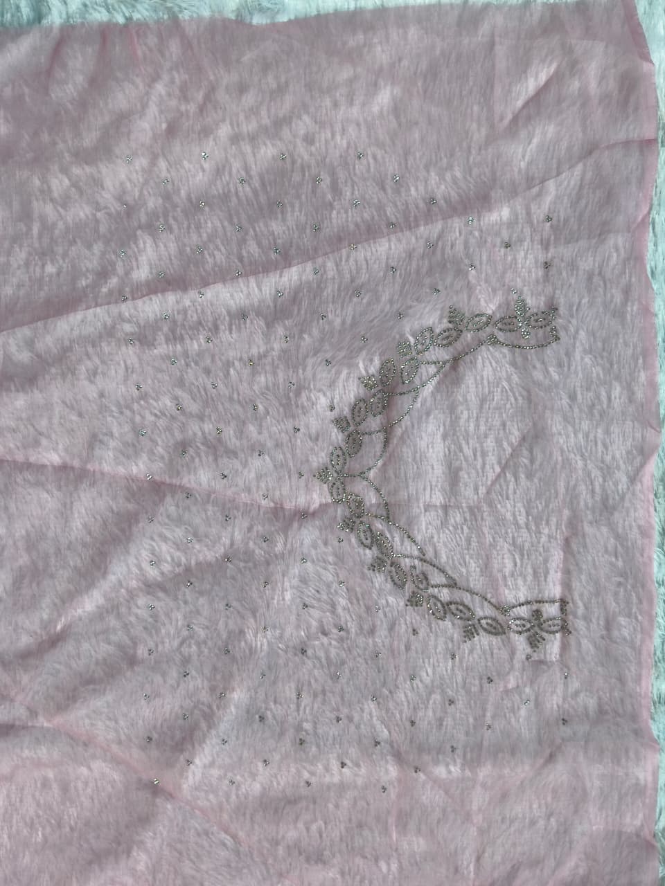 Adorned with intricate full heavy beads work and fine wall moti detailing, every inch of this saree reflects sophistication and craftsmanship. The delicate shimmer of embellishments adds a royal charm, making it a perfect statement piece for grand occasions.
