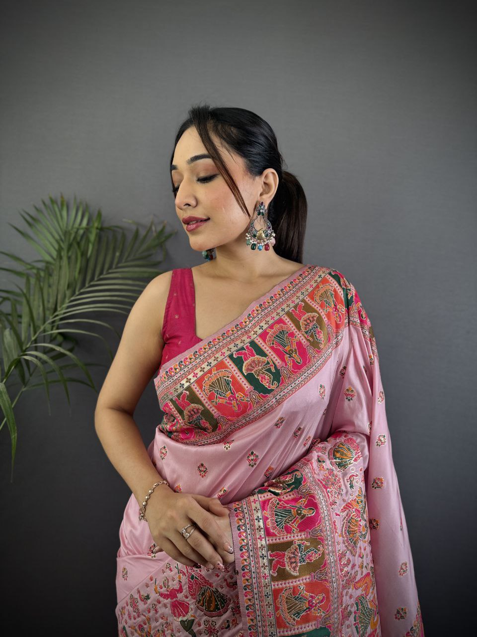 Fabric : Soft Kashmiri Pashmina silk weaving saree with all over colourfull meena weaves pattern with extraordinary stunning pallu and Fancy tassels