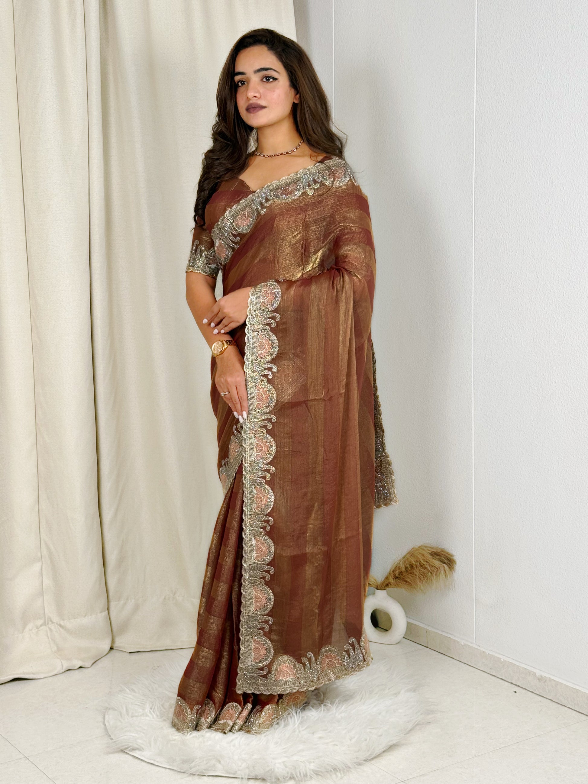 *This fandy chiffon saree, adorned with intricate zari embroidered with hand savroski work, is a dreamy blend of grace, luxury, and timeless charm*