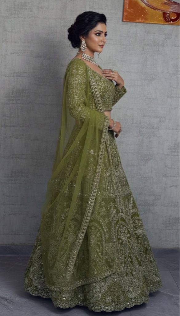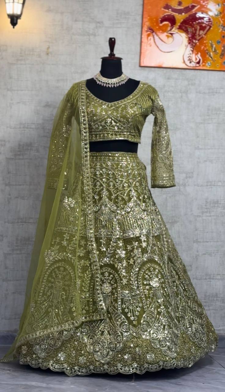 Lehnga en Georgette avec un travail de miroir en fil et papier avec une longueur de 3,25 mètres