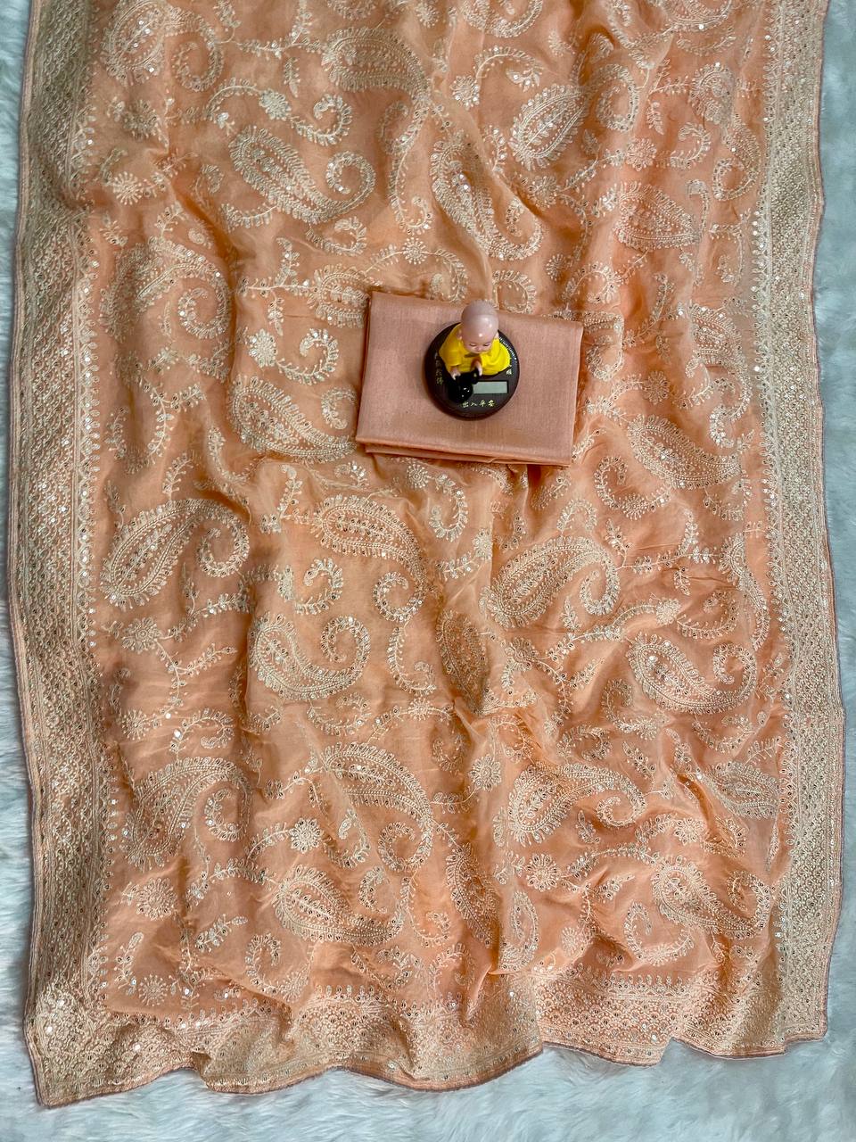 Vous recherchez quelqu'un pour ce magnifique sari de la même couleur pour un mariage sur un tissu premium *Soft Rangoli Silk* avec un codage blanc C-pallu sur toute la surface et un travail de broderie multiple Butti & Cutwork Border et un chemisier à broderie lourde.