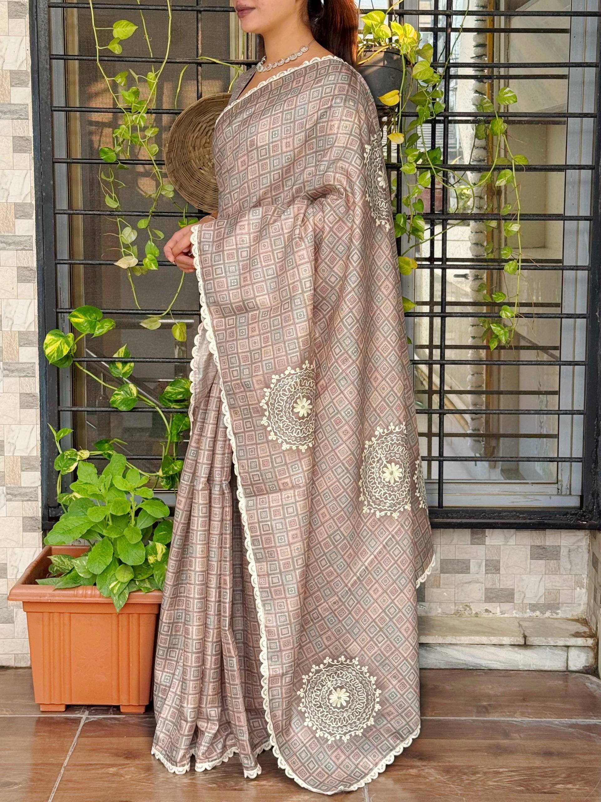 TISSU DE SARIÉS : - Pure soie Rangoli avec codage 3 mm c pallu Travail brodé et travail de butta sur tout le sari avec bordure de travail découpée