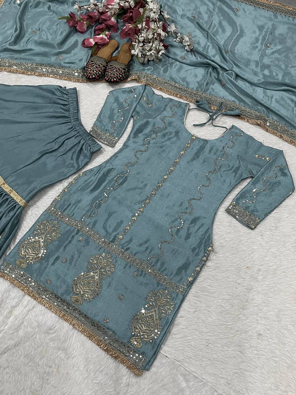 *Plazzo Fabrics* :chinon silk Heavy Embroidery Work With Fancy Borders Less Work Fully Flair.