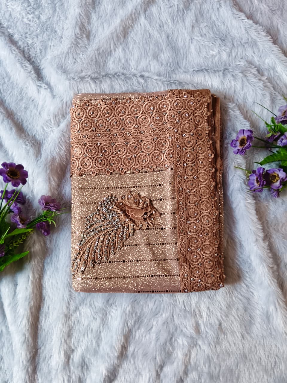 Step into pure elegance with this stunning rose gold designer saree set, crafted to give a rich and graceful festive look. The saree showcases a beautiful shimmer texture enhanced with intricate lace borders and delicate embellishments that radiate sophistication and charm.