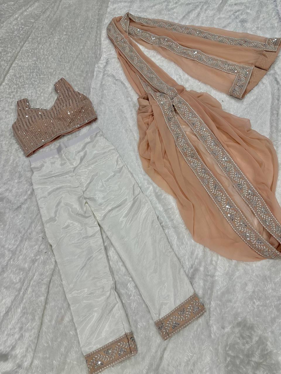 Get this stylish pre stitched saree with stitched pant & unstitched blouse for your convenience ..