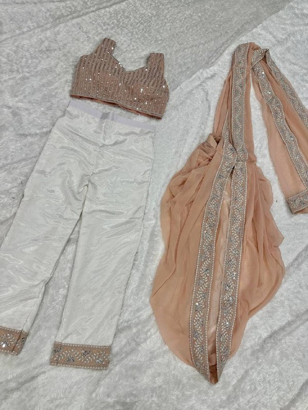 Faux Georgette pre stitched saree with sequins & Dori Resham thread work ( supportable upto 42 size with elastic waist )