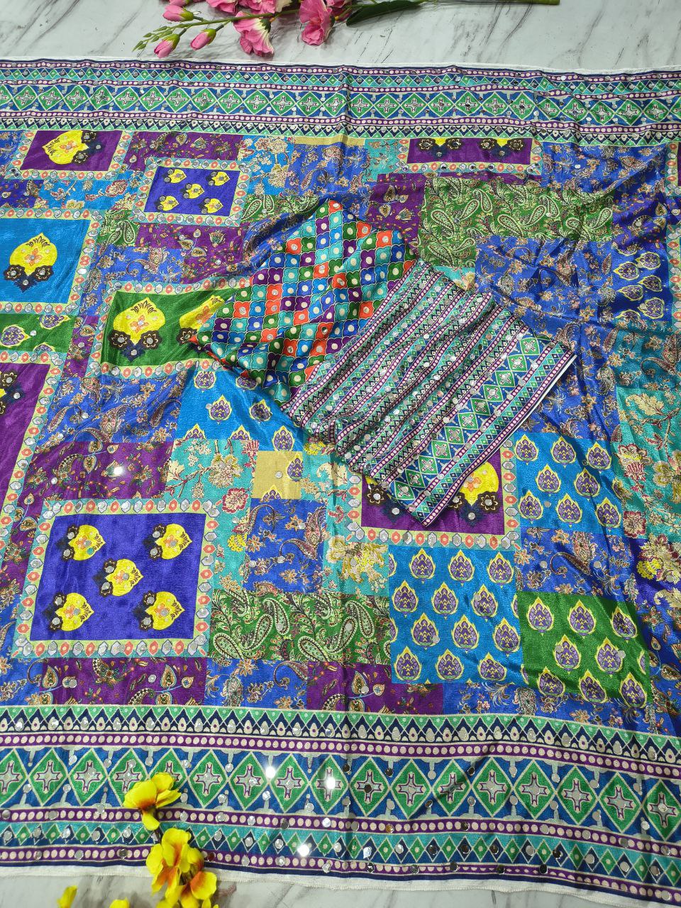Blouse : *Premium Chinon Silk With Beautiful Print And With Beautiful Real Mirror Work All Over*( Unstiched )