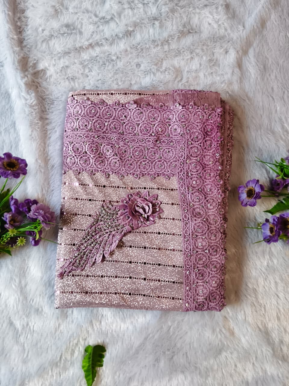 Embrace soft elegance and timeless charm with this beautiful rose pink designer saree set, crafted to enhance your festive and party look with graceful shimmer and delicate detailing. The saree features a luxurious textured shine complemented by intricately designed lace borders and subtle embellishments that create a refined royal appeal.