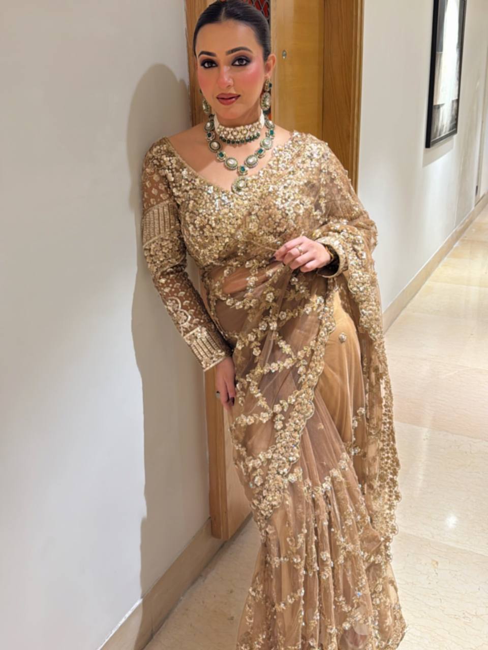 *😍The ethereal looks resplendent in our gold soft net saree. The drape showcases a scallop border with embroidery details Matched with a designer blouse, is a vision of majesty.*